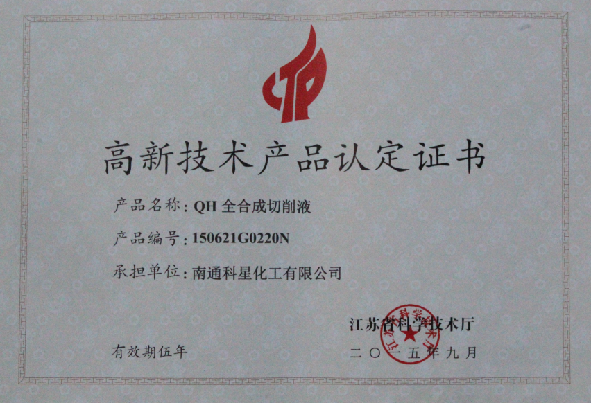 我公司QH全合成切削液榮獲省高新技術產品。該產品是一種新型環保高效切削液,與目前市場所用切削液產品相比較,具有更先進的技術水平,完全達到油性乳化液產品性能。使用周期長,管理得當,長期使用無需更換槽液。有著優良的潤滑極壓性、冷卻性,防銹性、沉降性、油水分離性和清洗性等性能,工作液清澈透明,適用范圍廣,適合各種金屬材料的生產加工工藝。