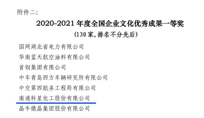南通科星化工股份有限公司獲全國企業文化優秀成果一等獎