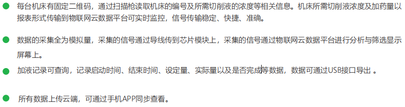 本系統(tǒng)通過掃碼槍讀取機(jī)床標(biāo)號及所需要切削液數(shù)量等信息,系統(tǒng)定量給機(jī)床添加工作液并記錄時間,數(shù)量等數(shù)據(jù),同時保存數(shù)據(jù)并上傳,本系統(tǒng)可移動、性能可靠、顯示直觀、操作簡單。